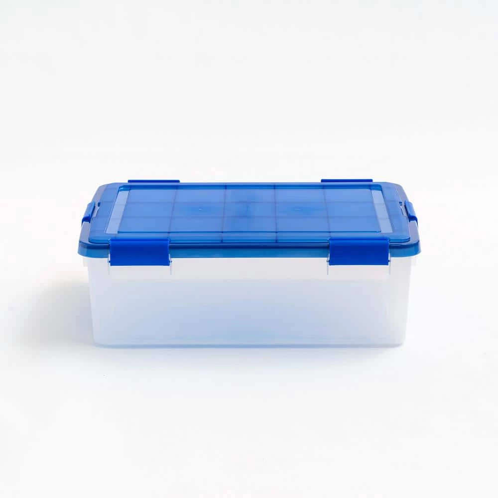 Store your favorite keepsakes and other large valuables in this 10 Gal. WEATHERPRO Plastic storage tote. The Weather Resistant seal on the storage bin lid protects contents by keeping air and moisture out. Safely store up to 40 lbs. of household goods, such as crafting supplies, camping gear, or clothing in these big storage bins. Grooves on the lid are designed to stack multiple of storage bins securely to maximize limited storage space. Create a customized storage with other sizes in this Element Resistant storage totes family; 1.5 Gal., 4.6 Gal., 7.5 Gal., 11.6 Gal., 15.6 Gal., 18.5 Gal. Set of four.