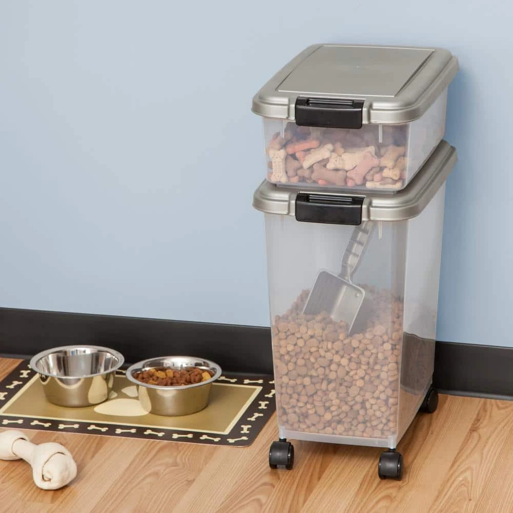 Meet the airtight container designed with your pet in mind. This plastic airtight container combo includes a 33 Qt. sealed storage container, a 12 Qt. sealed storage container and a matching 2-cup food scoop to easily measure out your dog food, cat food or any other pet food you want to store. Both airtight storage bins feature a foam seal and snap lock latches to keep contents fresh and keep pests out. Designed as pet food bins, these BPA free rolling storage bins offer many other uses as well such as leash and toy storage, wood pellet storage, grain storage, birdseed storage, cat litter storage or even as a charcoal container. The small food storage bin neatly stacks on top of the large 1 and the translucent bodies allow content levels to be checked at a glance. This IRIS 3-piece airtight pet food container combo is versatile, functional and the casters allow for easy mobility in any area of the house.