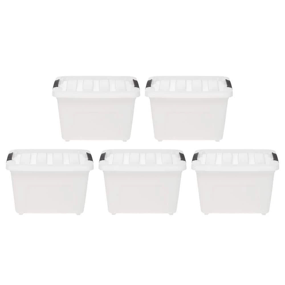 The modular storage bin system built to meet your needs. These 17 Qt. Stack and Pull storage boxes easily store shoes, craft supplies, office supplies, and more. Sturdy buckle up latches keep the lid securely in place, and the built-in handle makes it easy to pull the plastic bin off of a shelf. Storing boxes stack neatly with other units in the Stack and Pull series. Set of five.