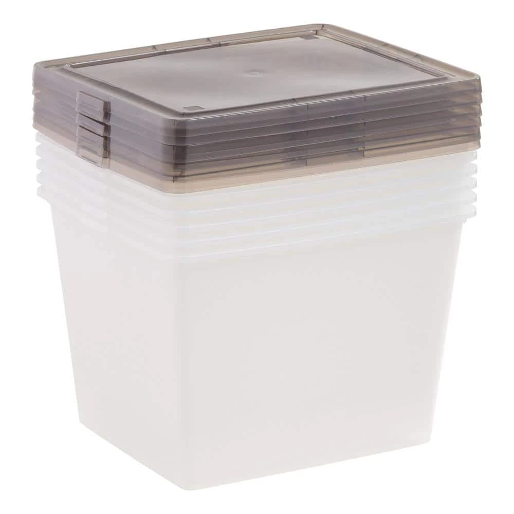 Do you have a shortage of storage. This classic storage box helps you gets to the bottom of the issue by fitting neatly under the bed, making sure no space goes to waste. Perfectly sized for clothing, home decor, and wrapping paper. The snap-tight lid adds a dash of color while keeping your items secure, and the ultra-clear body allows you to see contents at a glance. Set of 6 boxes are stackable to maximize any storage space.