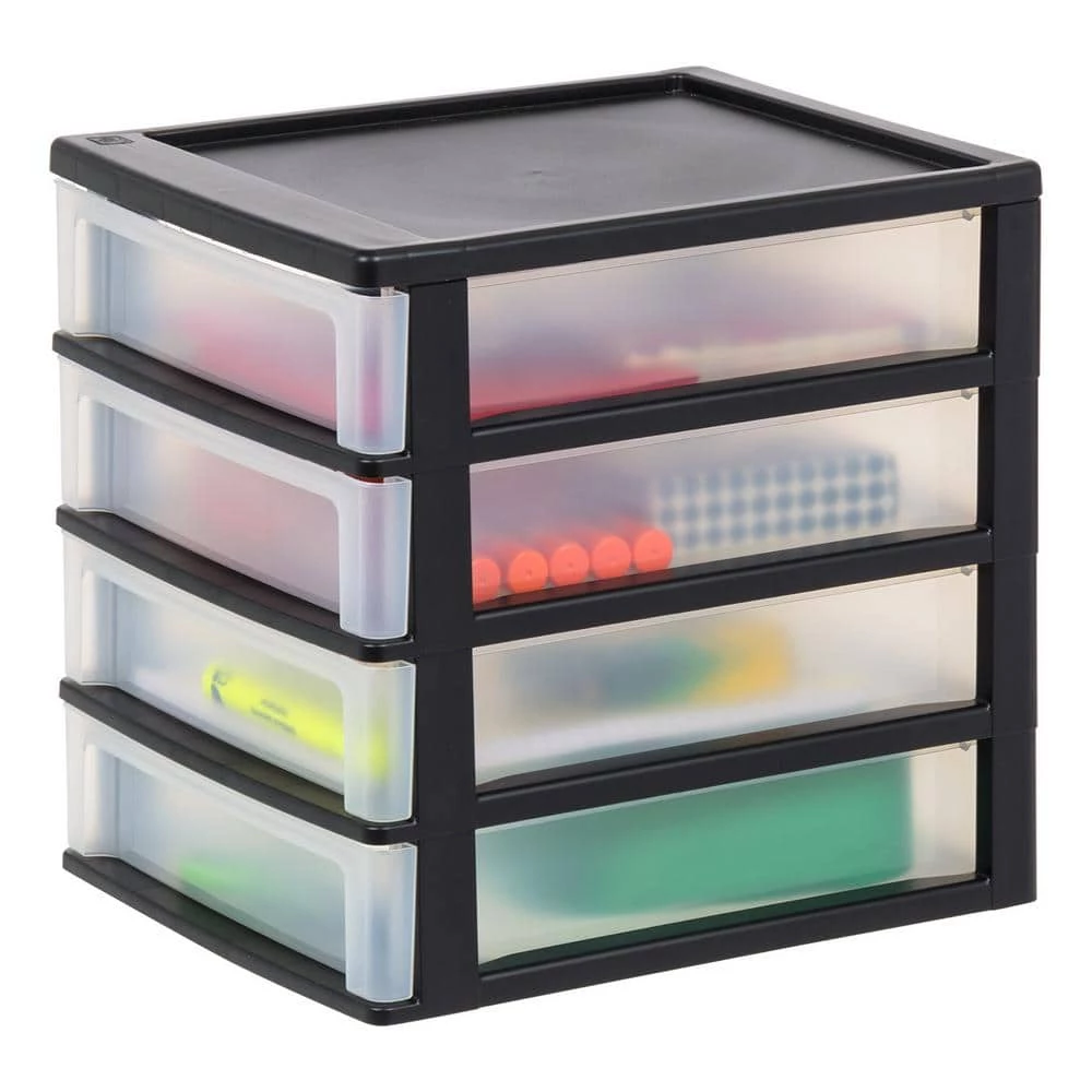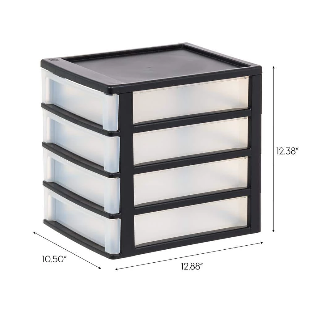 Store more with more space. The 4 drawer desktop units are great for maximizing storage. Great for your home, office or garage to clean up your desktop or shelf. Put anything from makeup brushes, first aid, craft, and office supplies. Our clear drawers make it easy for you to see where and what you’ve placed. Save some space by stacking the units. Organize and declutter your workspace or living area with our two set drawers. Made in the USA with global materials.