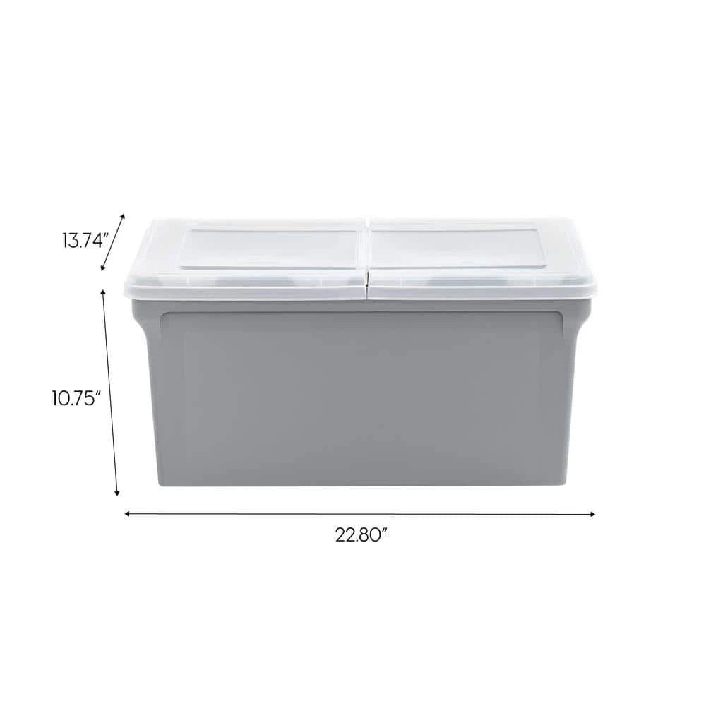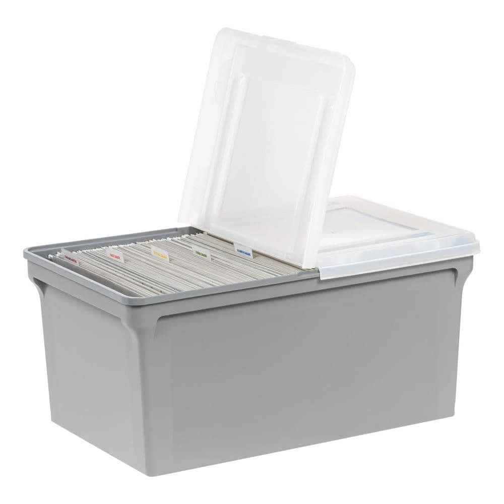 Storing your important documents has never been easier with this high-capacity file box. Organize your home or work office with these durable hanging file boxes. Large file totes accommodate hanging letter file folders. A sturdy file box split lid allows for easy access to files, and a file box with a lid means you can stack multiple units on top of each other to make the most of limited room.