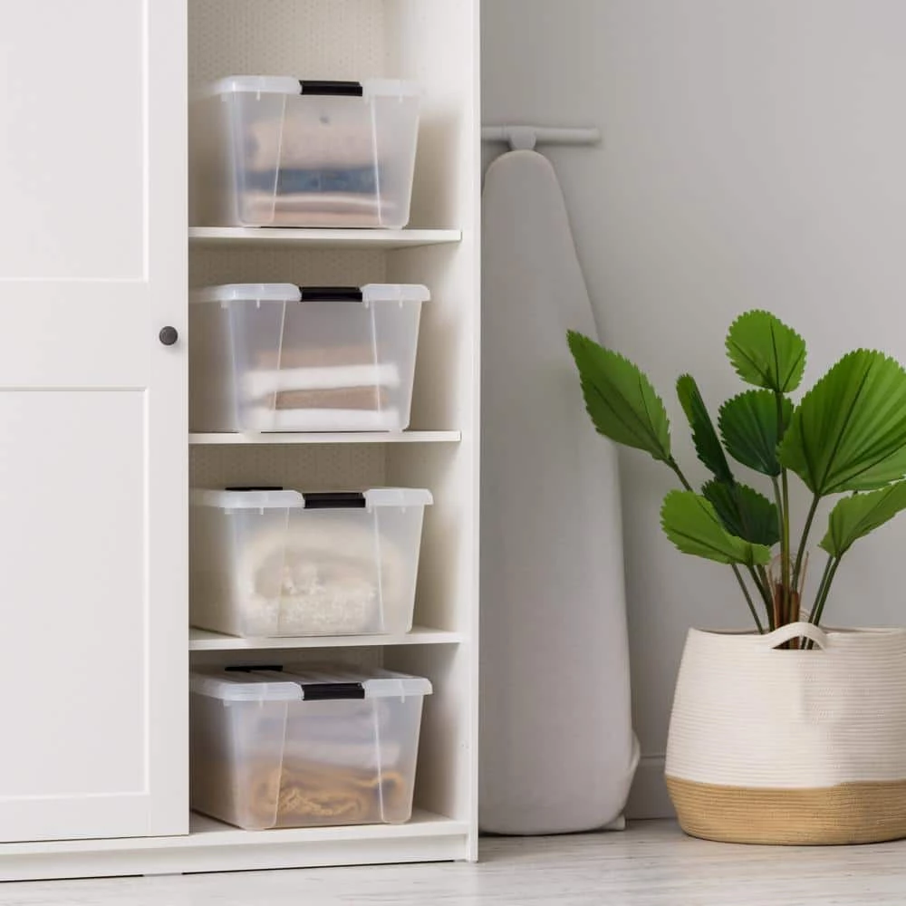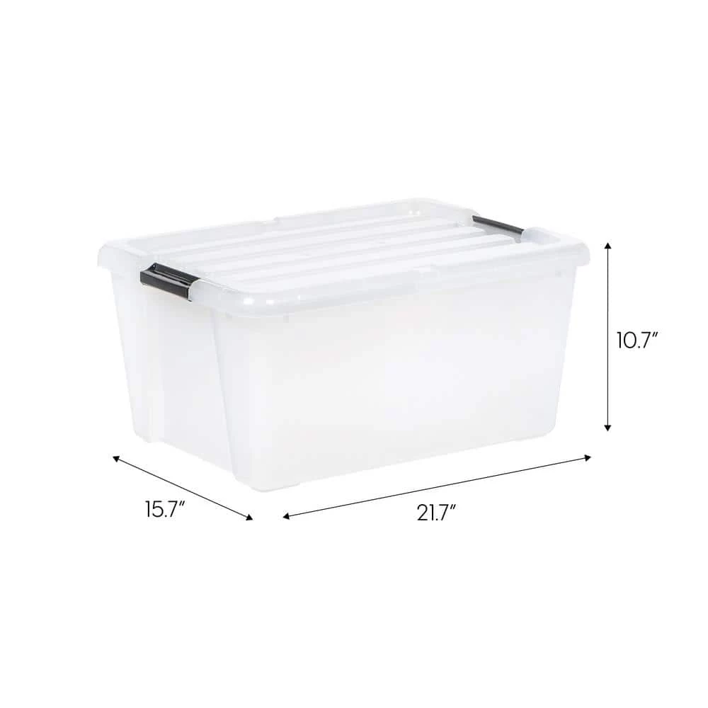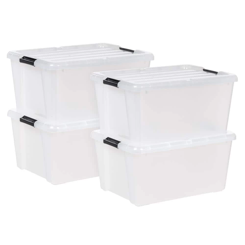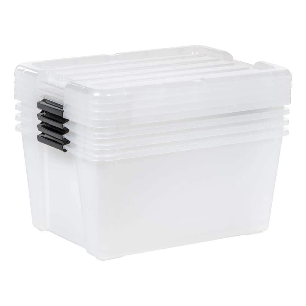 Clear buckle-up storage boxes will keep any rooms in your home organized. Stack multiple units of classic plastic storage bins to maximize storage space in a closet, garage, basement, or attic. This storage box is perfect for storing clothes, linens, blankets, toys, gardening supplies, and more. Buckles on the storage bin securely close the lid to protect contents inside. Set of 4. IRIS USA, Solution for everyday living!