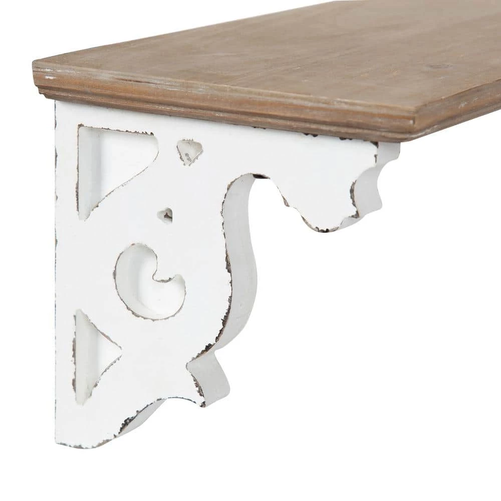 Indulge in a rustic, one-of-a-kind storage accent that saves space in your home with the beautiful Abbidee wall shelf from Kate and Laurel. Inspired by traditional farmhouse storage, this shelf features decadent, carefully crafted shelf corbels, in a swirling operatic pattern for an elevated accent. The Abbidee storage shelf has a careful blend of resilient woods to provide your home with a robust area for storage and display. Each shelf has a 15 lbs. weight capacity, with overall dimensions of 23.5 in. wide x 7.25 in. tall x 7.5 in. deep. These large dimensions and weight capacity allows you to use this shelf for bathroom necessities, kitchen spices, dessert dishes, mugs, and souvenirs. The Abbidee shelf looks excellent in any farmhouse-inspired bathroom, bedroom, dining room, kitchen, or living room. It is a unique way to save space in your home while elevating your rustic decor. This shelf hangs in only a matter of seconds, with metal keyhole hangers attached to the back.