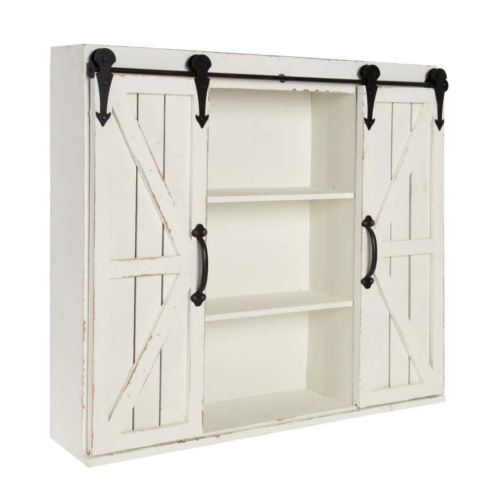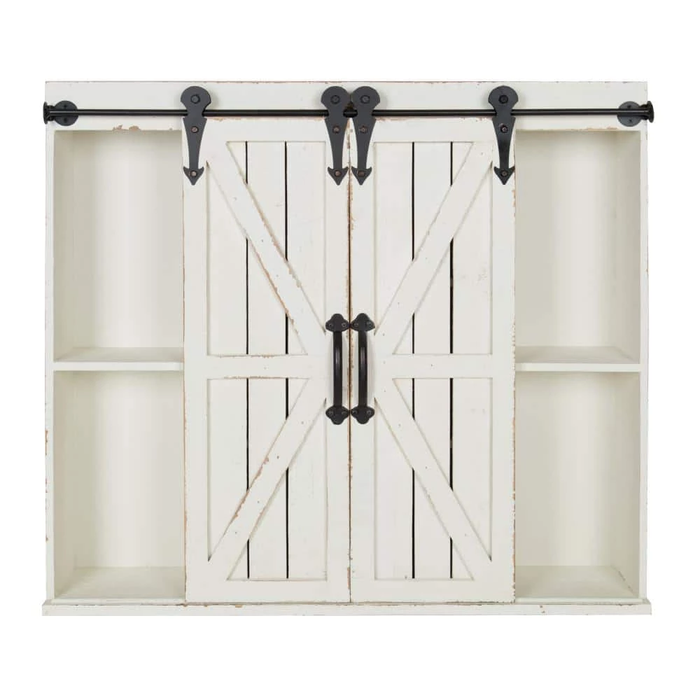 Decorate your home in vintage farmhouse style with these unique hanging wall shelves with sliding barn doors. These shelves can be used to organize your entryway, mudroom, kitchen, bathroom, living room, or guest room. This box shelf has three inner shelves and each side has two shelves to store items of different shapes and sizes. The two barn doors slide to cover either the sides or the center. The three center shelves are each 13.5 in. wide, 5.5 in. deep, and there are 7.5 in. of height between the middle and bottom shelf and 7.25 in. of height between the top shelf and the frame. The side cubbies are each 7.25 in. wide, 5.5 in. deep, and have 11.75 in. of height between the two shelves. The outer dimensions of this wall shelving unit are 30 in. wide, 27.25 in. high, and 7.25 in. deep. Two metal Z-bracket hangers are inset on the back of the cabinet for easy secure wall display. This wall cabinet arrives completely assembled ready to use.