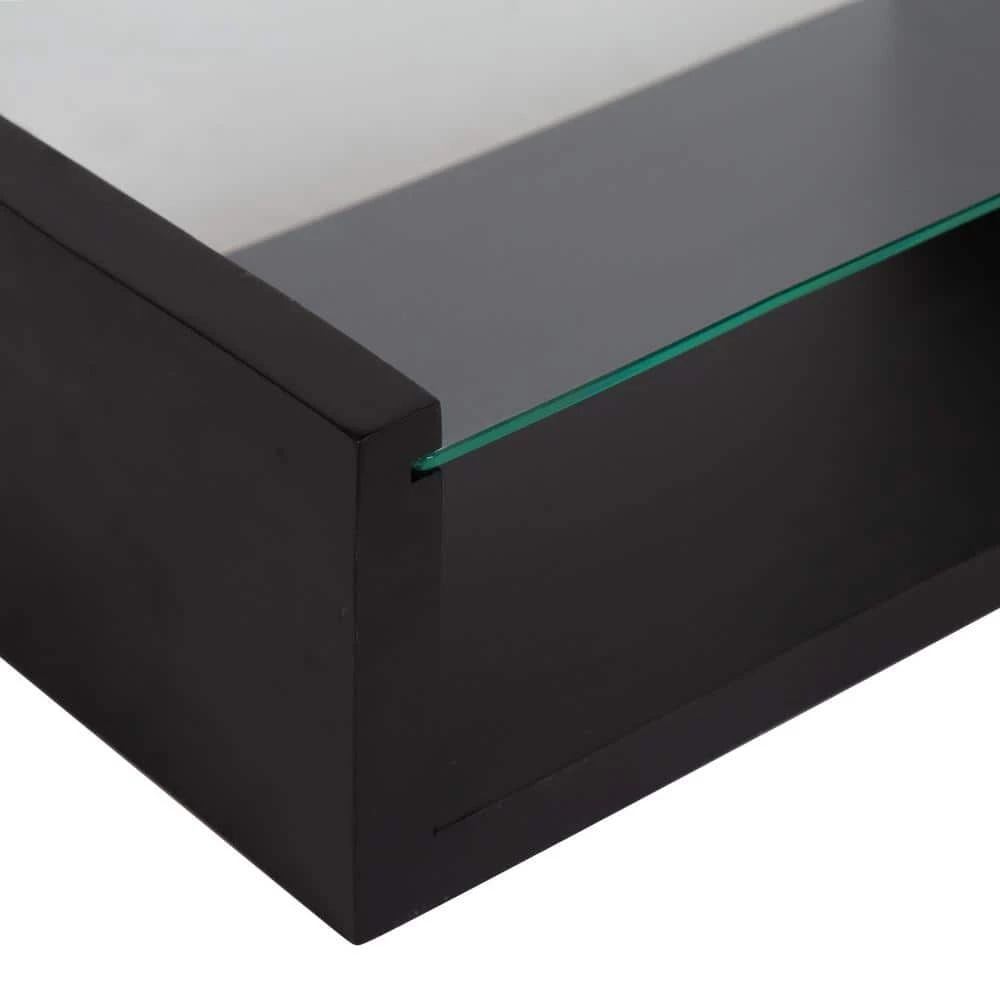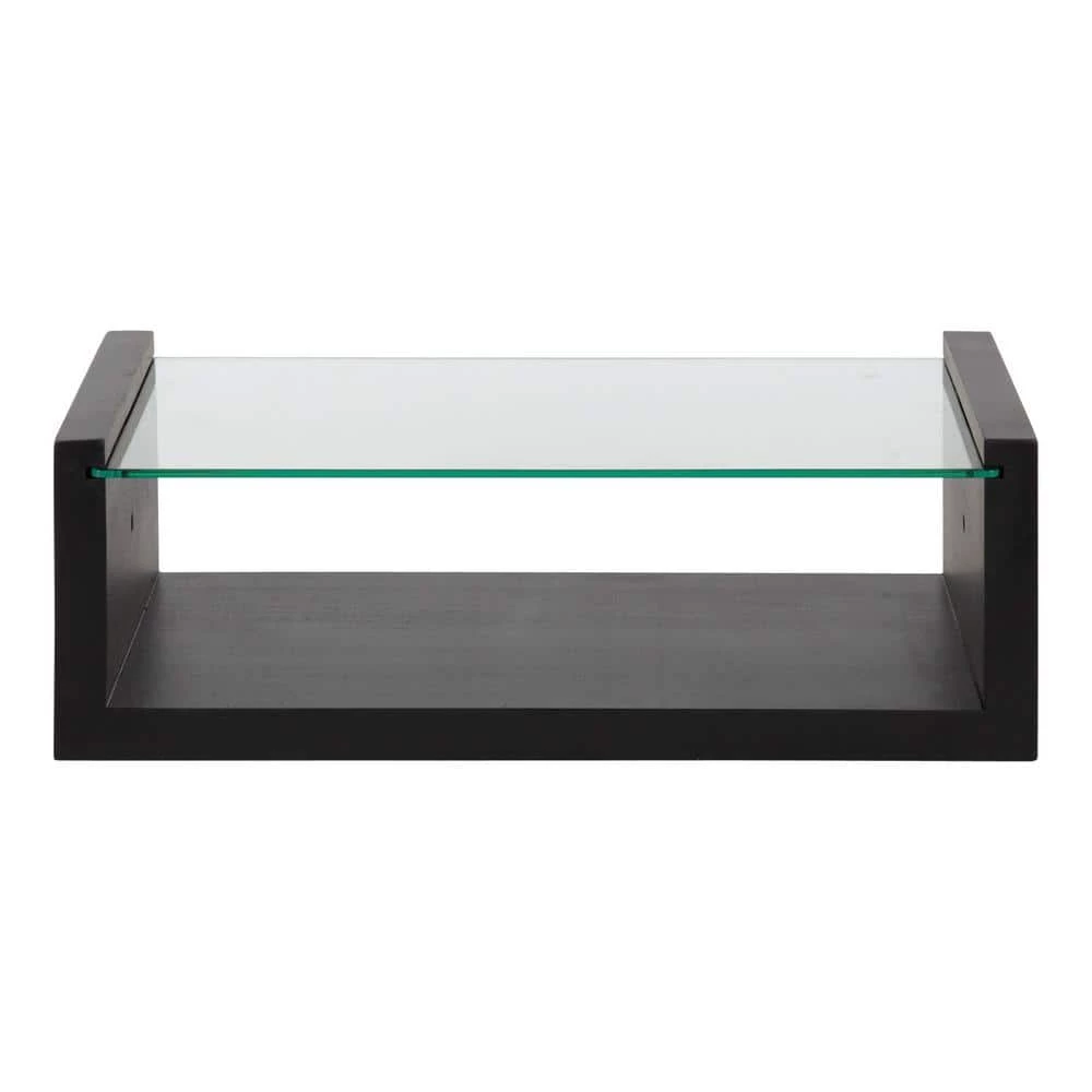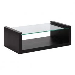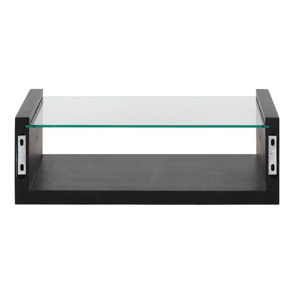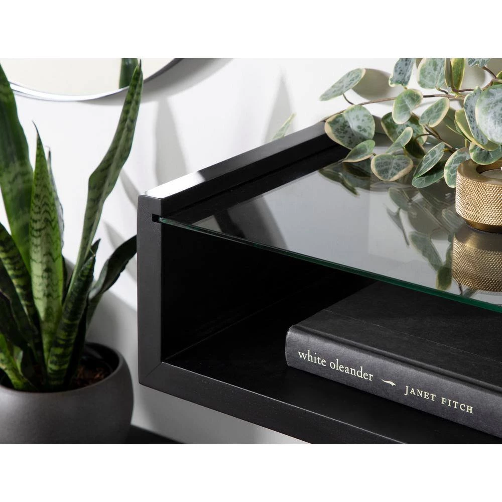 Bring a sophisticated, modern decor detail to your home that packs a lot of function with the Holt floating shelf from Kate and Laurel. Inspired by minimalist decor themes, this shelf features a simple design of clean lines and a sleek black finish. The wood base is resilient and high quality, with a slight groove in the top for the 5mm tempered glass. This tempered glass is a fantastic display area for hosting small decorative plants, a group of photos, or other keepsakes. The overall dimensions of this lovely shelf are 18 in. wide x 10 in. deep by 6 in. tall, making it an excellent floating display piece on its own or in an arrangement of multiples. There is 4.25 in. of height between the internal wood shelf and the glass top, making it a fantastic place to put media, media players, game consoles, books, and more. This functional modern shelf is fantastic by the bed, next to the doorway, or below your TV. Hang the Holt shelf in a matter of seconds with the convenient, secure hanging brackets attached to the back of the wooden frame.