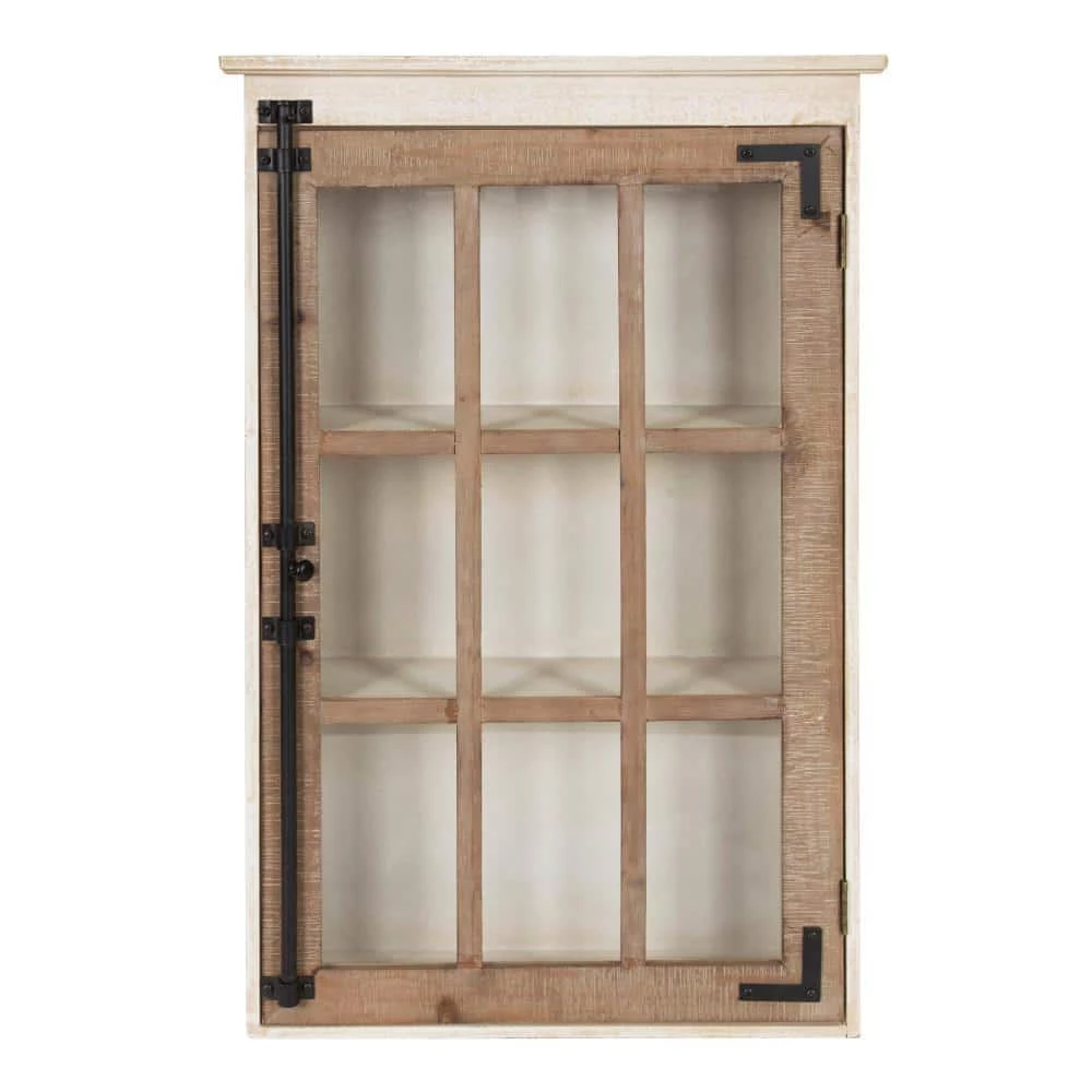 - Hutchins wall storage cabinet provides function and style with decorative charm, the rustic wooden rustic and white-washed two-toned finish and glass windowpane like door adds a classic addition to your home decor