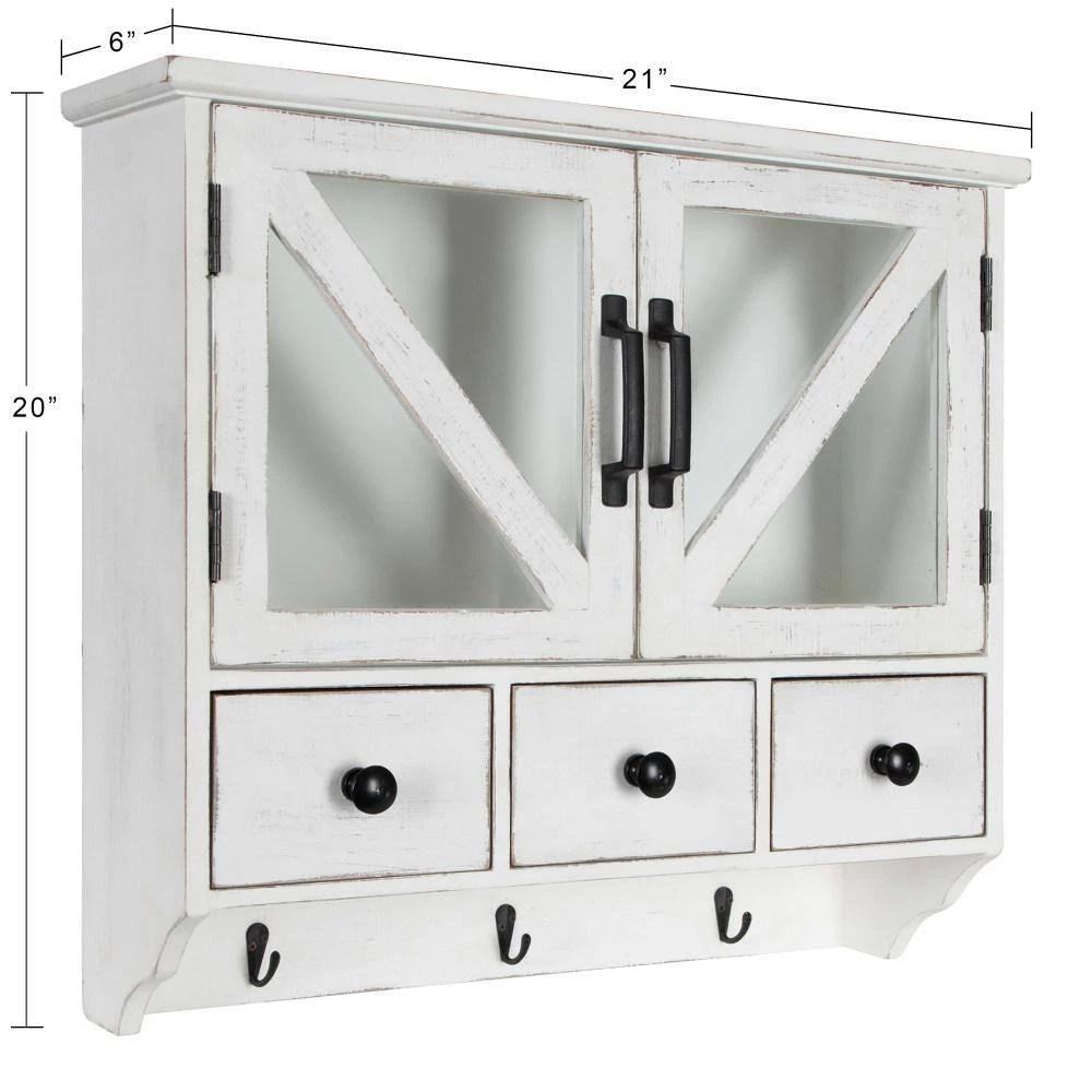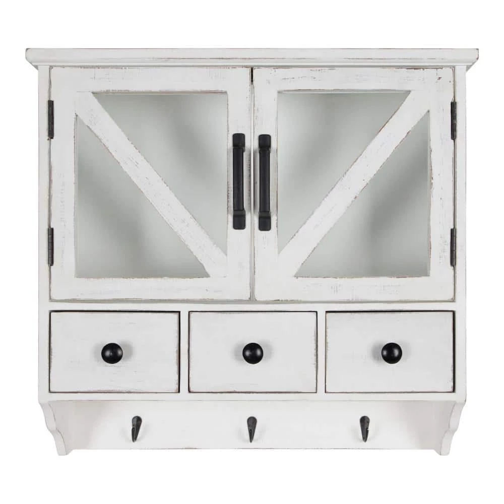 Get inspired by your rustic home decor with this beautiful, coastal piece from Kate And Laurel. The Hutchins Wood Wall Cabinet offers space-saving storage and a distressed, reclaimed wood look that is guaranteed to draw the eye of all your house guests. This wall organizer features distressed wood and a rustic, coastal white finish. Since it is distressed by hand, each Hutchins Wall Cabinet has a unique finish that’s one-of-a-kind. Store glassware, mail, and other items within the 11 in. high by 19 in. wide by 5 in. deep cabinet, made with magnetic glass doors to keep your more fragile items secured. You can also use one of the three wooden drawers to store jewelry, postcards, and other small keepsakes. It’s not just for your entryway or kitchen, however, use this wall organizer as a decorative statement piece in your living room or as a medicine cabinet organizer in your bathroom. The Hutchins Wall Cabinet ships fully assembled and easy to hang with attached keyhole wall hangers and included hardware.