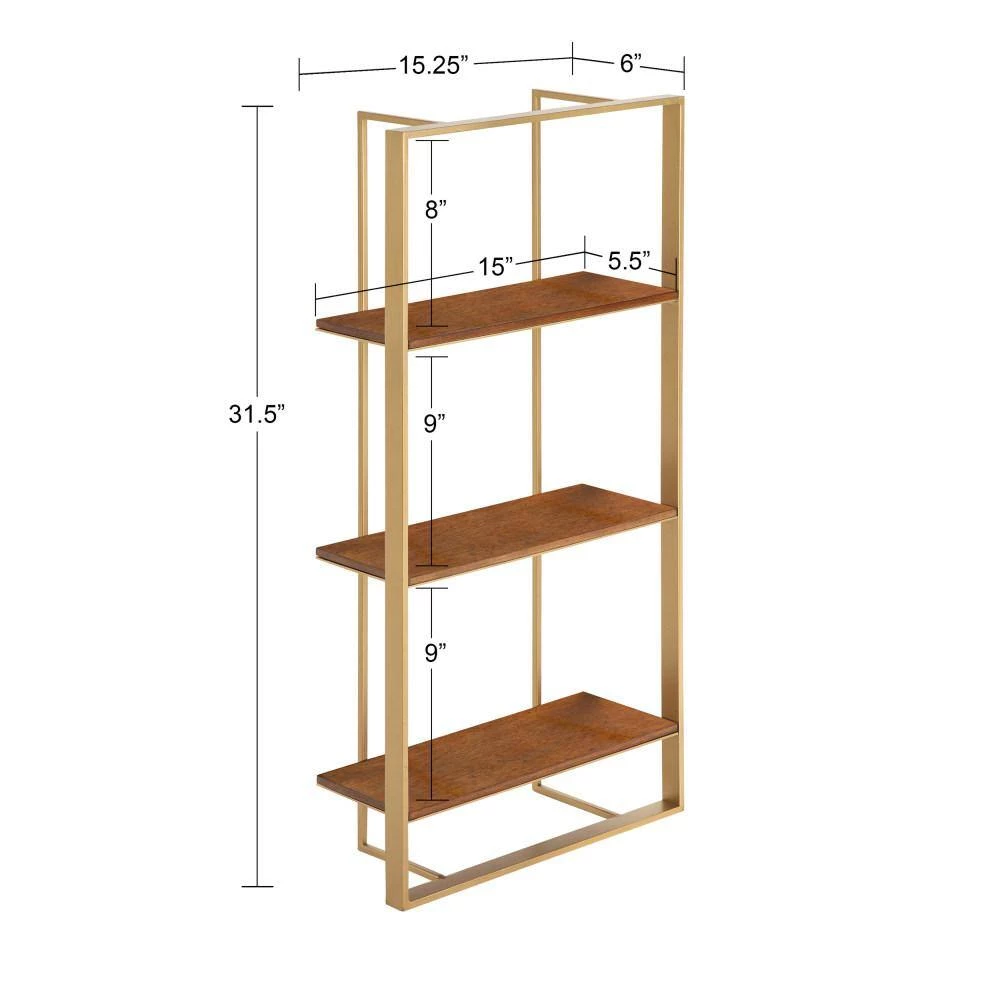 The stunning Kercheval Wood Shelf brings an elegant, mid-century modern twist to your standard display and storage needs. This shelf uses a gold-painted metal frame with three walnut wood tiers, designed to fit comfortably within compact spaces. It saves space in the rooms you need it most, like your bathroom, office, living room or kitchen. Reduce clutter on your desk or table by using this shelf as another area to display keepsakes, small plants or photos. You may also use it as a decorative alternative to the standard medicine cabinet, using the three narrow shelves for cologne, medicine, lotion and shaving kits. The Kercheval Wood Shelf also makes a great addition to your kitchen, where you can utilize it as a spice rack for your next feast. However you decide to use this modern glam accent piece, it makes for an eye-catching focal point in any room of your home. It also ships fully assembled, so it’s ready to hang in only a matter of seconds. Let your storage double as a stylish alternative to traditional wall art.