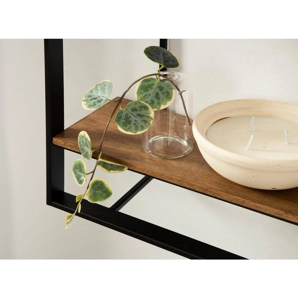 Create a sophisticated display and indulge in modern farmhouse style with the 3-tier Kercheval wall shelf. The Kercheval shelf indulges in clean lines and minimalist design, with a simple metal frame and three rectangular wooden shelves. Each tier of this robust unit has 8 inches between each shelf, providing plenty of room to showcase awards, plants, small keepsakes, and more! The overall dimensions of the Kercheval wall shelf are 15.25 inches wide by 6 inches deep by 31.5 inches tall, while each shelf is 15 inches wide by 5.5 inches deep. The straightforward design and two-tone rustic brown and black finish look excellent in various living spaces, such as the living room, bedroom, entryway, bathroom, or dining room! You could also use the multiple-tiered design to create a lovely bookshelf for short novels and other treasures. Hanging this floating wall decor takes a matter of minutes, as each Kercheval shelf includes hardware and metal eyelet hangers attached to the back of the frame for quick and efficient installation.