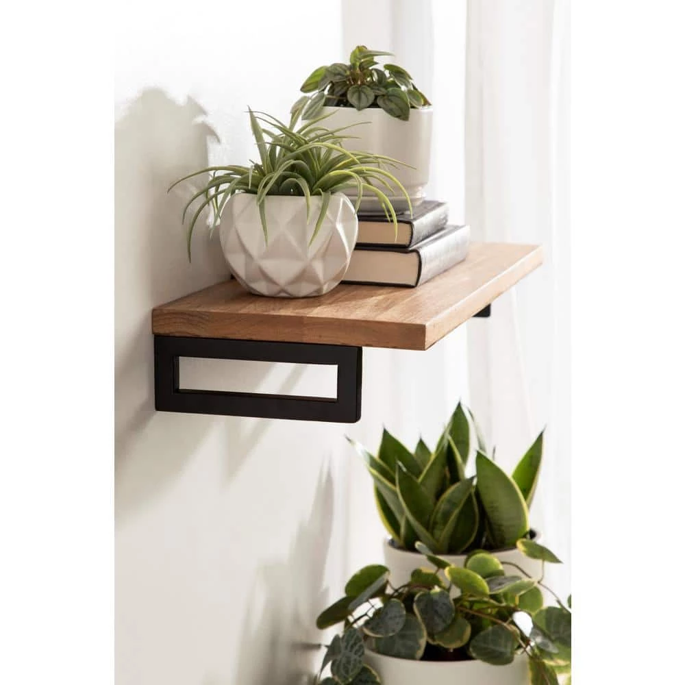 A beautiful way to layer your decor and elevate your wall display is the beautiful Lankford shelf. The Lankford wall shelf takes inspiration from simple, Scandinavian design, featuring a clean look with a lovely two-tone natural wood and black finish. The Lankford features a mango wood tabletop and a metal base for a robust look and premium quality. It’s handcrafted in India by skilled artisans, giving it a distinct finish and woodgrain. This is the perfect surface to use as a floating bookshelf, a plant display, or functional storage in your kitchen, bedroom, or entryway. The overall dimensions of the Lankford shelf are 24 in. wide x 8 in. deep x 3 in. thick, which is a fabulous display piece on its own or in an arrangement of multiples for a robust storage area in your home. It’s also an excellent way to save space in your home while showcasing your personality through photos, accents, and more. Hanging this shelf is simple and straightforward with the pre-drilled holes in the metal base.