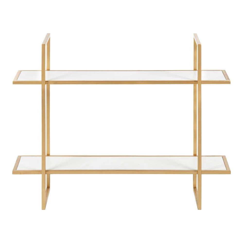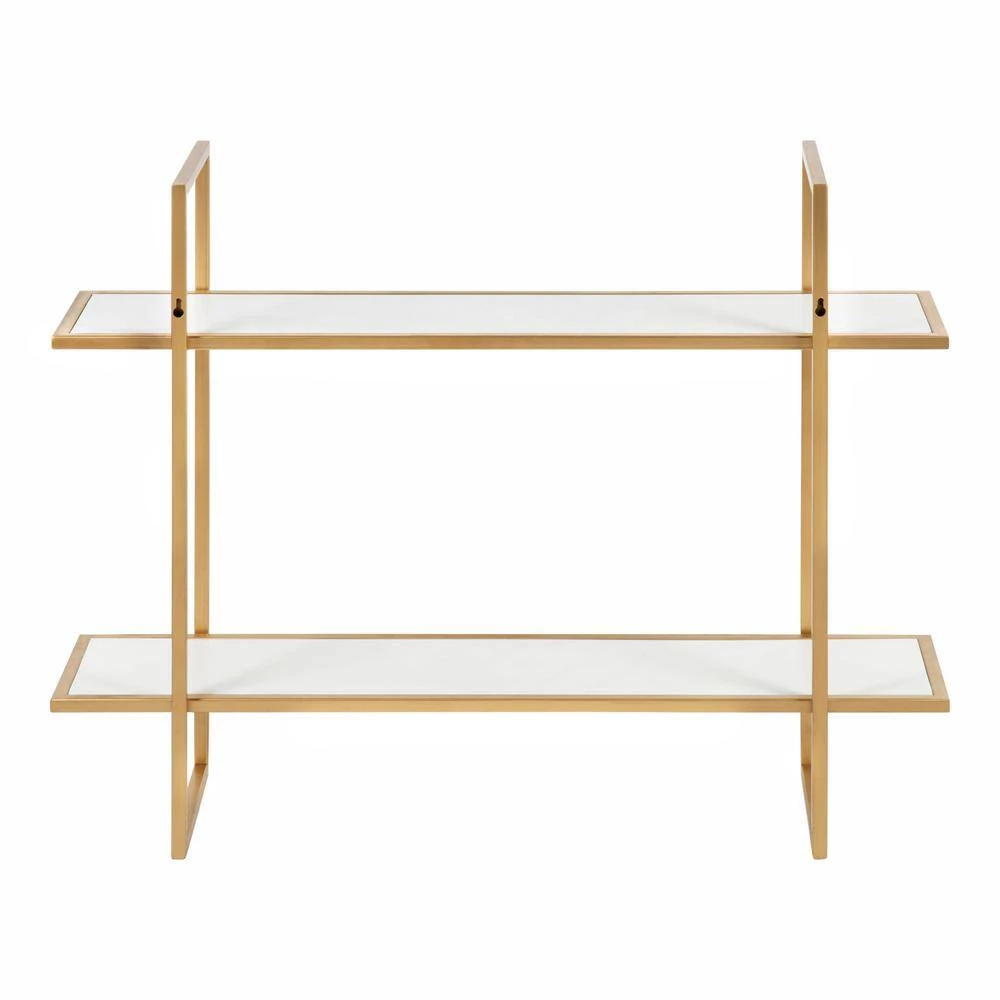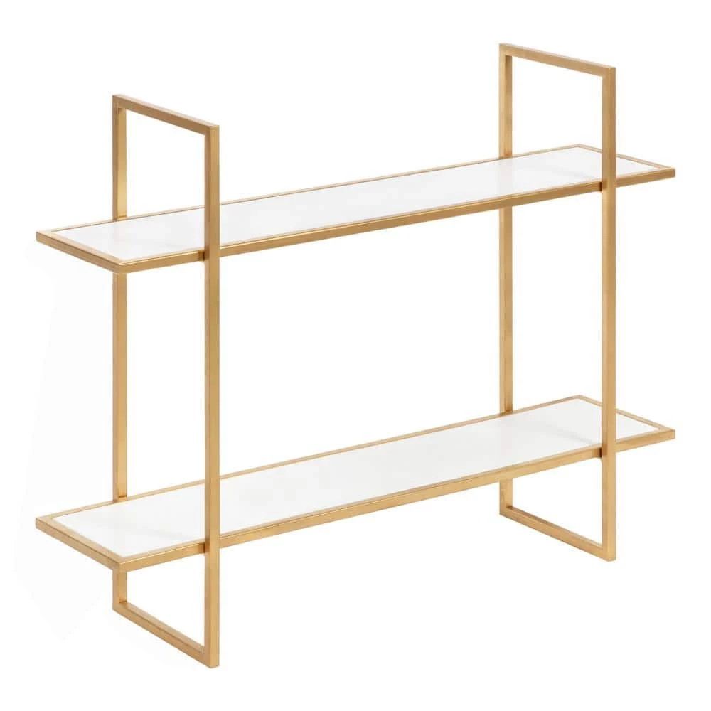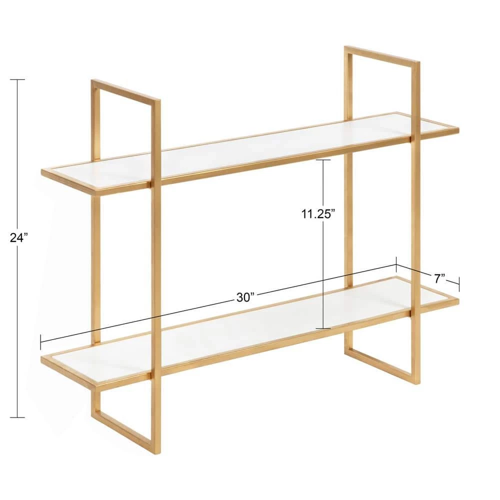 Invest in more than just a standard storage shelf. The Leigh Wall Shelf has an elegant, modern style with a glam gold metal frame and two white MDF shelves. This storage shelf has a variety of different uses: Utilize its space-saving design to display your favorite family memories, keepsakes or adorable small succulents. The Leigh Wall Shelf also makes a functional spice rack or a place to store small china bowls. Each of the wood shelves is 30 in. x 7 in., with a weight capacity of 10 lbs. for a convenient display of your more substantial decorative pieces. There’s also an opportunity to create a makeshift bookshelf by purchasing multiples and stacking them on one another. If you prefer the traditional shelf installation, however, you can use the metal keyhole hangers and brackets to hang this glam wall decor in a matter of seconds. It has never been easier to create a glamorous statement piece in your home, with step-by-step instructions for easy assembly. Add this modern statement piece as a space-saving solution to your bedroom, living room, kitchen or home office.