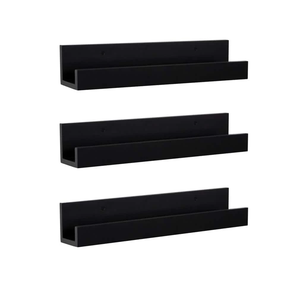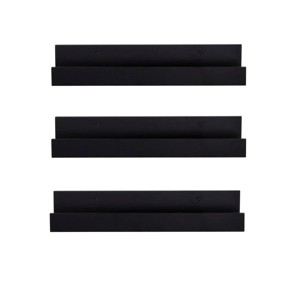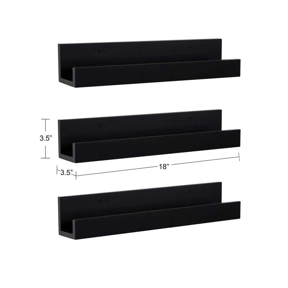 Create a modern wall display that taps into the quality craftsmanship with the Levie shelf set. Each shelf is 18 in. long and 3.5 in. deep, with a 1.75 in. front lip. The inner area depth of 2.5 in. gives you enough room to layer your picture frames to create a gorgeous modern wall statement. Each wall ledge in this set looks beautiful on its own or displayed as 1-symmetrical gallery. The black finish also allows each ledge to blend into any modern decor theme. They ship fully assembled and ready for wall display right out of the box. 2-holes are pre-drilled 16 in. apart to easily hang on your wall. These floating ledges are crafted of quality manufactured wood for lasting durability. Use these photo rail shelves in the living room, bedroom or any room of the home to display your photo memories or art in contemporary design.