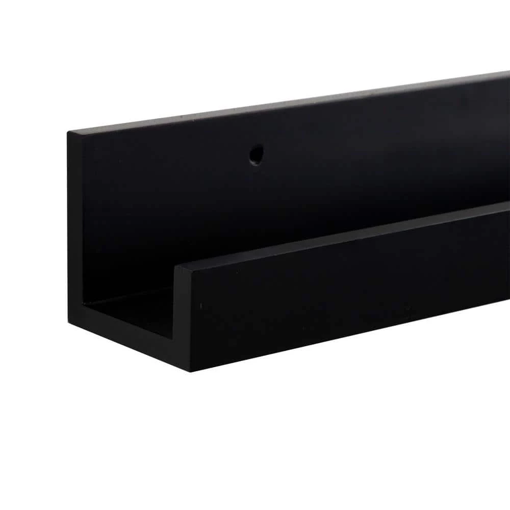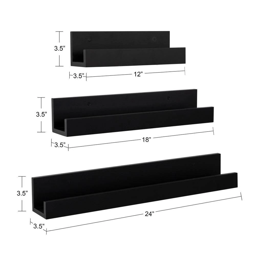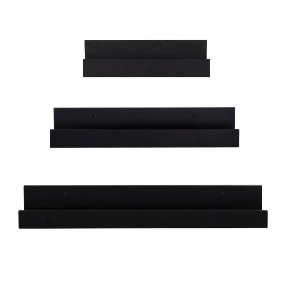 Create a modern wall display that taps into the quality craftsmanship with the Levie shelf set. This set of shelves has an increasing shelf size, with the smallest at 12 in. wide, the medium is 18 in. wide and the largest is 24 in. wide. This provides you with an interesting opportunity to create a staggered vertical or horizontal wall display. Each ledge is 3.5 in. deep, with a 1.5 in. front lip, allowing you to display photos and art loosely without the worry of them sliding off the shelf. The inner area depth of 2.5 in. gives you enough room to layer your picture frames to create a gorgeous modern wall statement. Each wall ledge in this set looks beautiful on its own or displayed as 1-symmetrical gallery. The sleek black finish contributes to a minimal look with a clean design. These shelves ship fully assembled and ready for wall display right out of the box. 2-holes are pre-drilled to easily hang on your wall in a matter of minutes. These floating ledges are crafted of quality manufactured wood for lasting durability. Use these photo rail shelves in the living room, bedroom or any room of the home to display your photo memories or art in contemporary design.