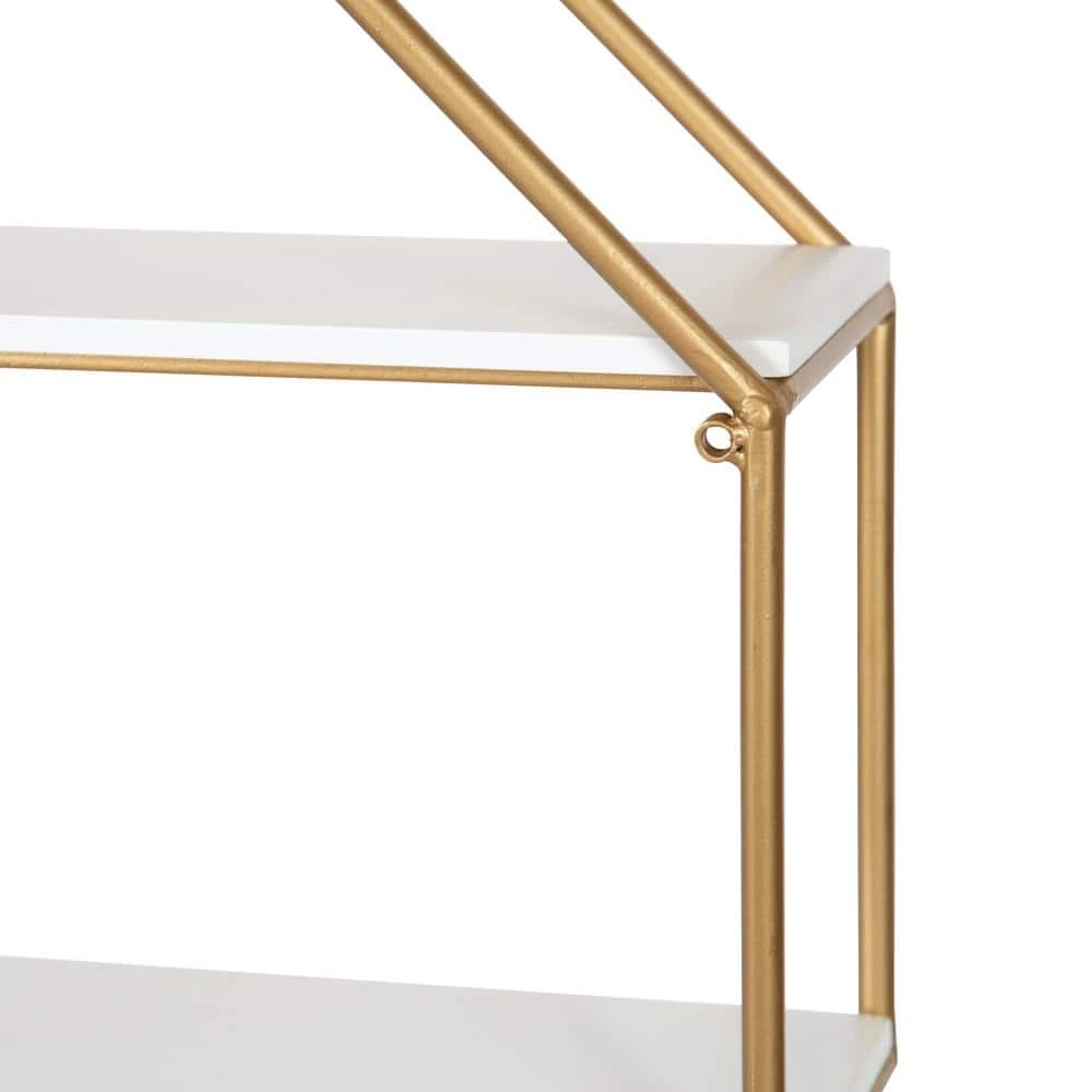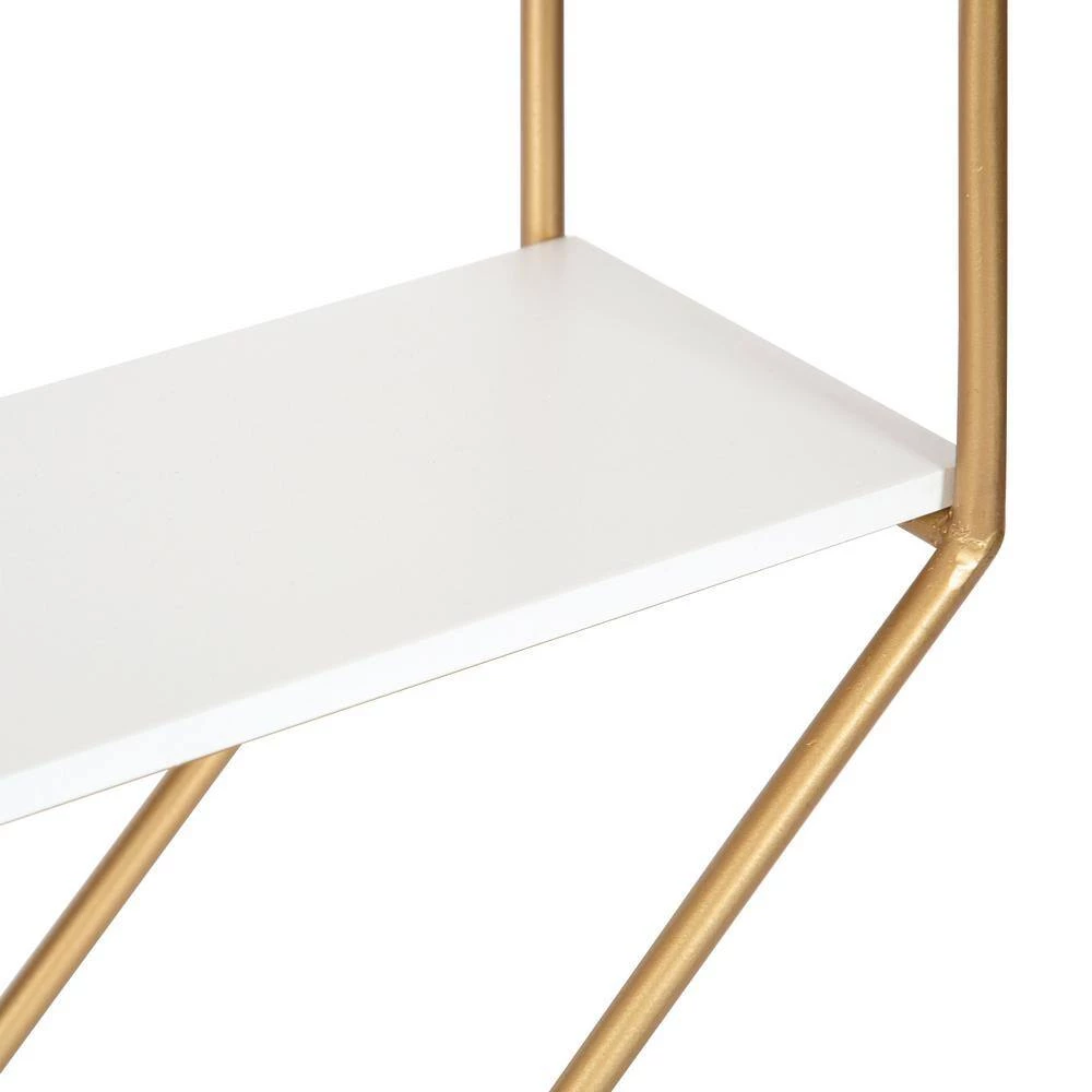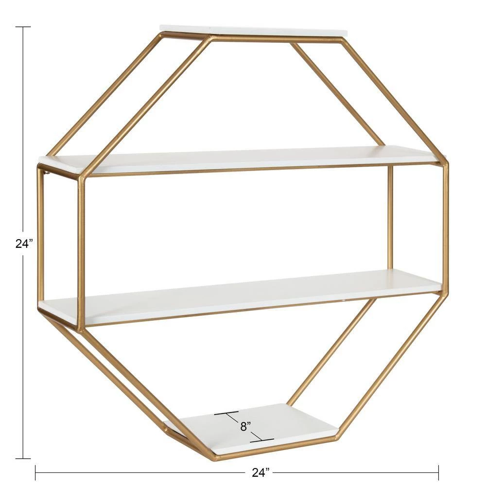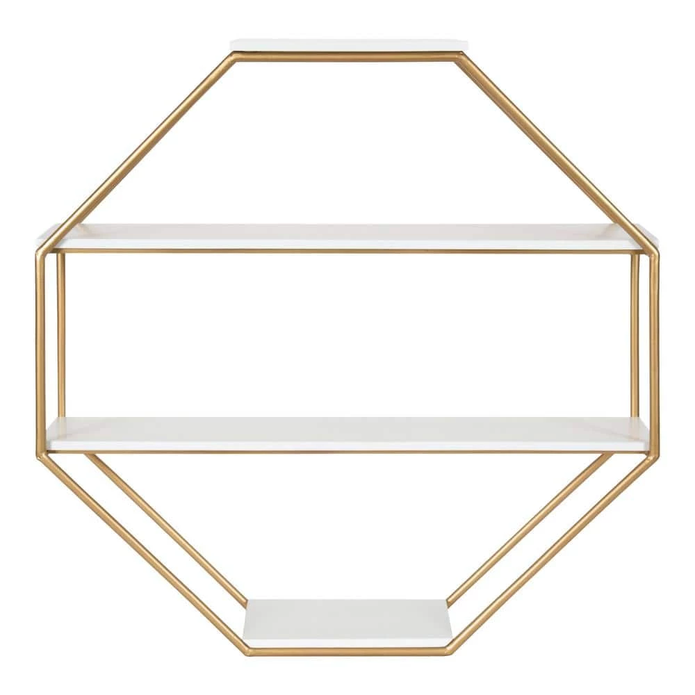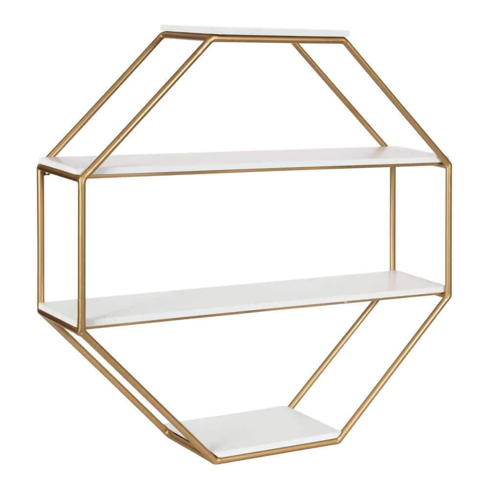 The new Lintz shelf from Kate and Laurel offers your home a sophisticated storage solution that is both contemporary and space-saving. Inspired by modern design methods, the Lintz has a geometric octagon shape, constructed of a resilient metal for multiple years of display. Within this metal frame, you’ll find 4-rectangular shelves with robust wooden construction. The top shelf is 8.4 in. wide x 5 in. deep, and the bottom shelf is 9 in. wide x 5 in. deep, providing 2-smaller spaces for palm-sized succulents or adorable keepsakes. The 2-middle shelves are each 24 in. wide x 6 in. deep, which is fantastic for little books, plants, or powder room necessities. Each shelf is 8 in. apart, and with a 7 lbs. weight capacity, they’re perfect for decorating however you see fit. This functional accent piece looks fantastic in your office, entryway, living room, dining room, or bathroom. Its symmetrical design is excellent when purchased in multiples and displayed side-by-side. Hang the lovely Lintz shelves in a matter of seconds with metal eyelet hangers attached to the frame.