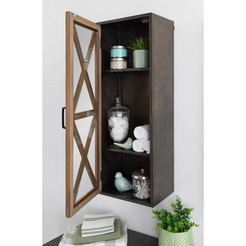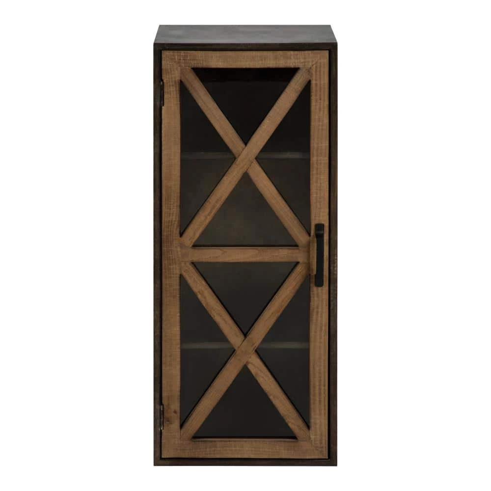 Save space in your home with this rustic farmhouse storage solution from Kate and Laurel. The Mace Floating Storage Cabinet adds a warm rustic edge to your home while storing your favorite books, DVDs, mail, photo frames, and more. This shelf has a warm, rustic brown finish on the surface of its front door, with a distressed bronze metal finish on the case. The door has a wood overlay with glass windows, plus a magnetic closure to prevent your items from falling. The cabinet has two inside shelves, with 8 in. of vertical space between the top and bottom shelves, and 13.25 in. of vertical space in the center, providing you ample room to store any media, books or small keepsakes within your home. It mounts in only a matter of seconds with metal keyhole hangers secured to the back. Better yet, with the versatile placement of these keyhole hangers, this floating storage unit is capable of being mounted both vertically and horizontally. Use the three inner shelves for storage and the top surface area for display. If you want to create a dynamic wall display, its heavily recommended that you purchase multiples.