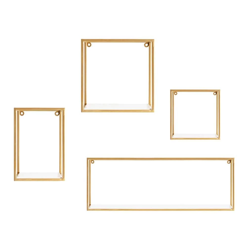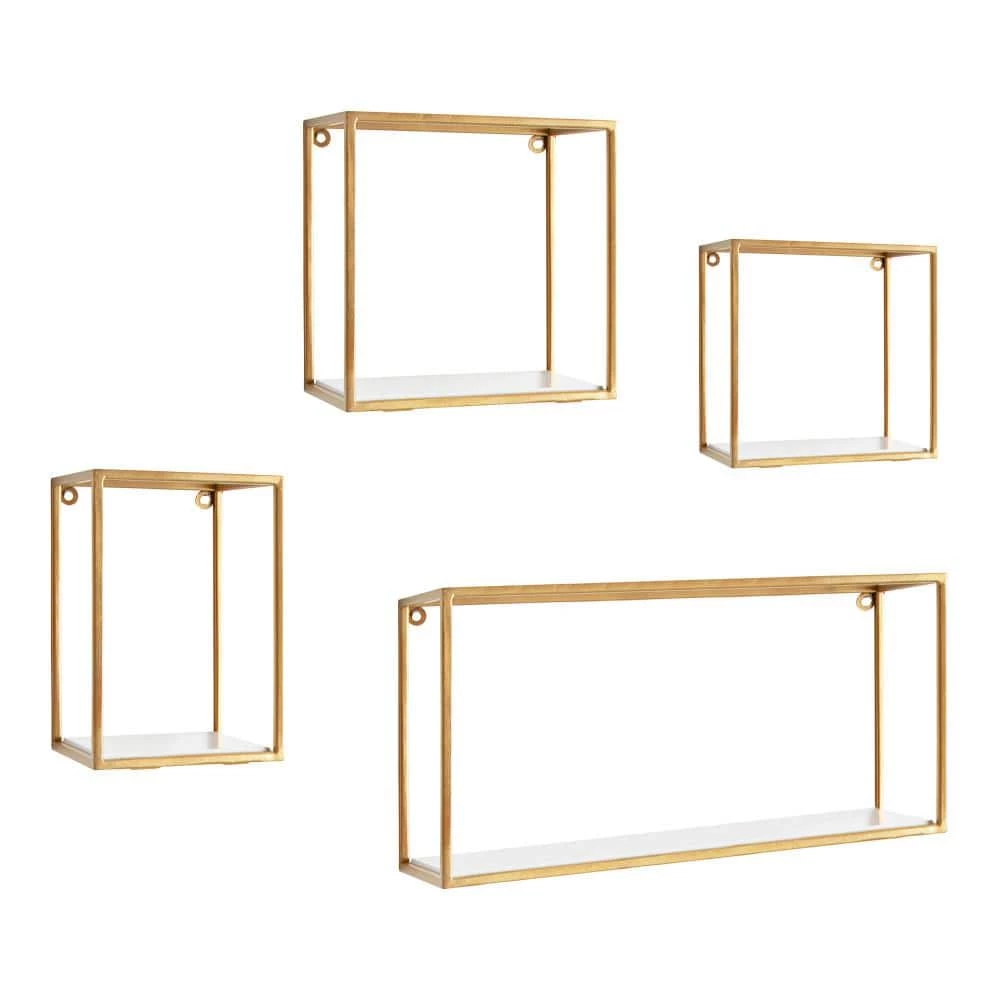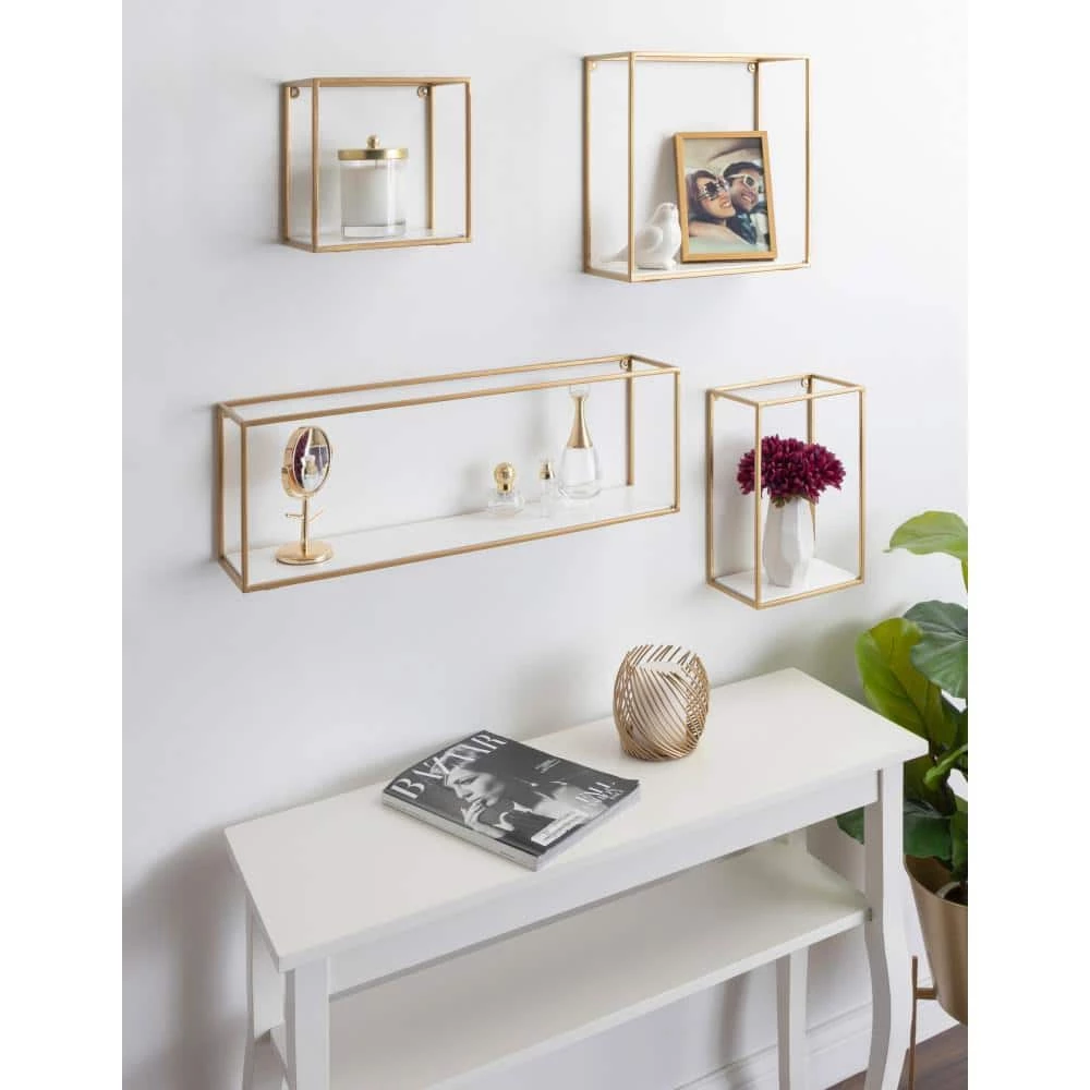 Bring your glam decor into the 21st century with this minimalist set of wall shelves designed by Kate and Laurel. This set features a glam look with a chic, gold-finished metal frame and a white base. The Mallory Shelves features a variety of sizes to display as a collection or spread throughout your home. These modestly sized shelves are an excellent way to store and display small plants, photos and keepsakes in your living room entryway, bedroom or dining room. Or, if you want a unique storage opportunity in your master bathroom or powder room, install them next to your sink and store lotions, soaps and more. You could even use them as handy kitchen decor, creating an avant-garde spice cabinet or pantry. With a variety of sizes and plenty of functional use, there’s no limit to what you can do with these shelves. Mount them on your wall in a matter of seconds with the easy-to-use eyelet hangers discreetly attached to the back of each shelf.