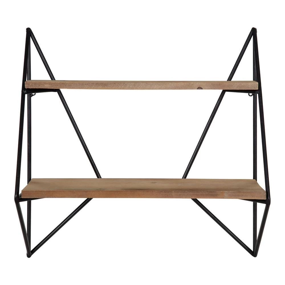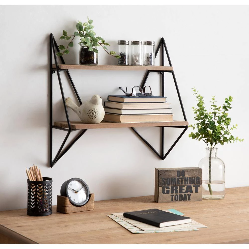 The Kate and Laurel Melita 2-Tier Floating Wall Shelf is a small-space friendly shelf with a lovely modern farmhouse casual style. The chic solid wood shelf boards feature a handsome tiered arrangement. The narrow top shelf creates a chic ledge for small item display while the more significant, lower shelf makes for an elegant space for storing books, vases, family pictures and other trinkets. This gorgeous unit with its striking black metal frame will brighten up any room and showcase your love of design. The overall dimensions are 19.5 in. Wide x 19 in. Tall and 7 in. Deep.