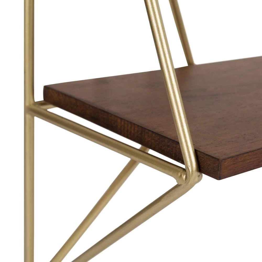 - ENHANCE YOUR WALL DECOR: This artistic wall mounted shelf features a stunning gold metal frame and a rich walnut finish. This floating shelving unit exudes mid-century modern charm