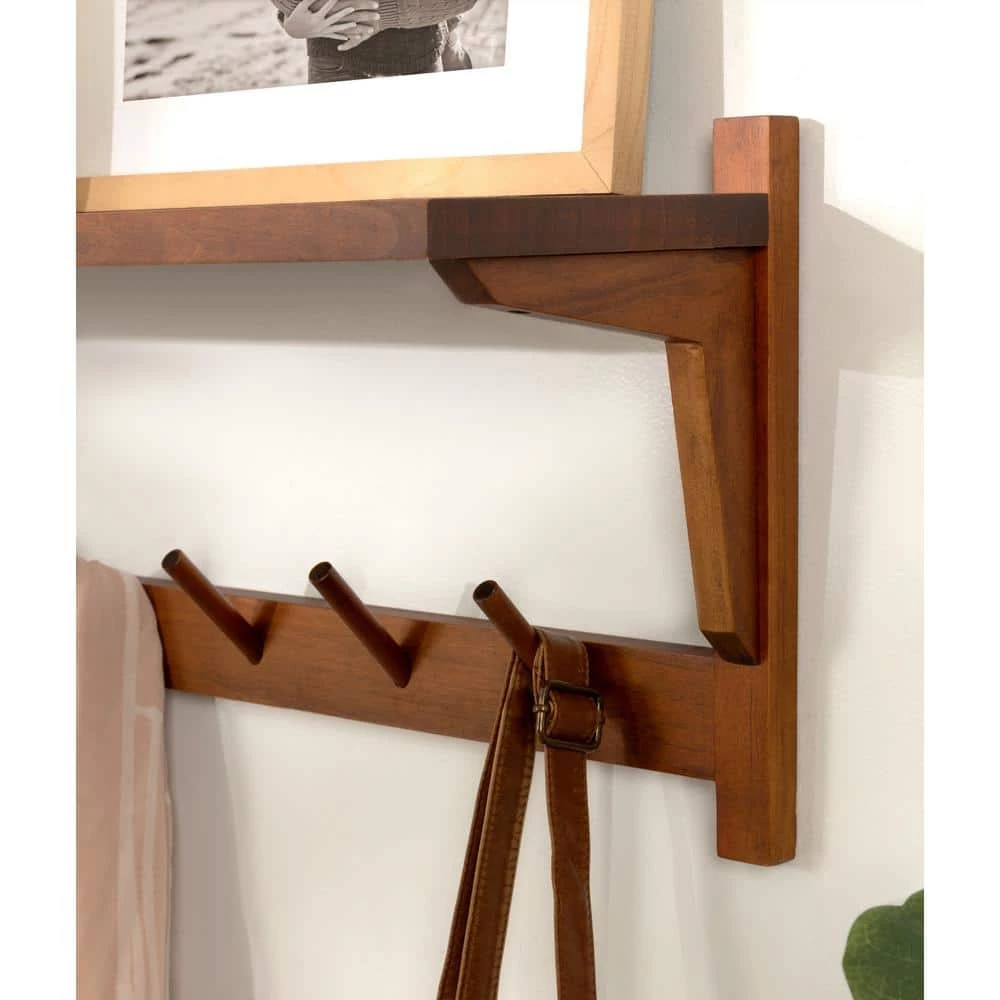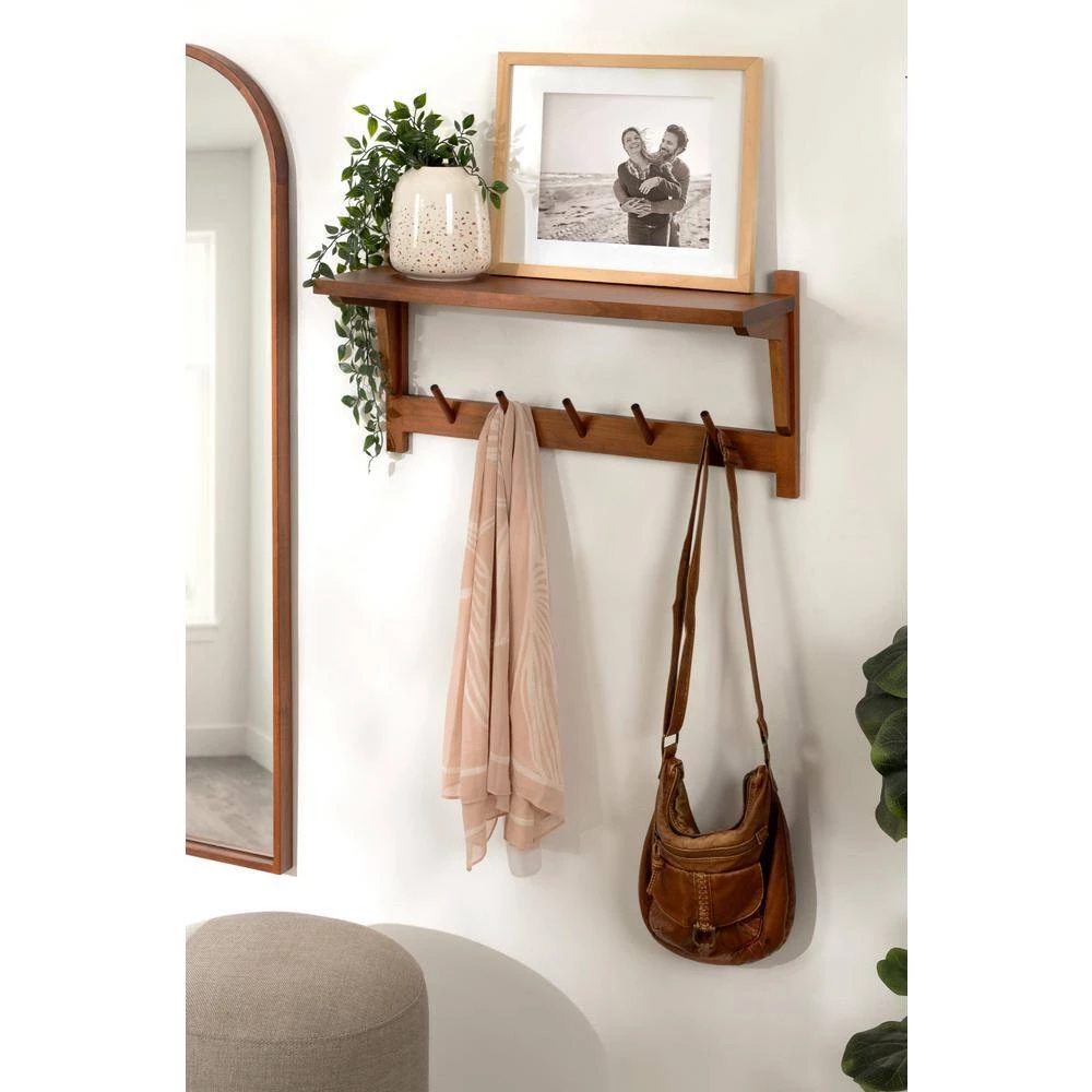 Purge your space of stress and complicated clutter by mounting the lovely Meridien wall shelf as part of your home decor. Inspired by the warmth of mid-century style, the Meridien has a multifunctional yet stylish design, featuring a wall shelf and five hanging pegs. This shelf is crafted from solid wood to create a robust look and performance, ensuring display for multiple years to come. This wooden material also has a walnut brown finish to create a comforting look that fits into any room scheme. The Meridien’s overall dimensions are 24 inches wide by 8.25 inches deep by 11.5 inches tall, working in the entryway, bathroom, office, living room, or even bedroom decor. The functional wood shelf is fantastic for showcasing small accent pieces, storing toiletries, mail, and baking items, or acting as a key holder catch-all. You can use the five hanging pegs underneath this shelf to hang anything from pet leashes to bathrobes to even lightweight jackets or aprons! To mount this floating shelf, use the metal keyhole hangers attached to the back, providing efficient yet sturdy installation in minutes.