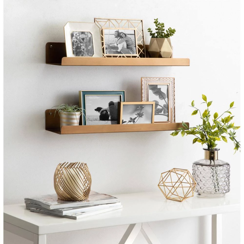 The Mezzo Modern Shelf is a simple way to display your favorite pictures and keepsakes without a complicated mounting method. This floating wall shelf set includes two 24 in. shelves to mount flush against your wall to create a beautiful display space. This set of two is a simple, minimalist solution for your display and storage needs. Each shelf has a heavy-duty metal composition, with the capacity to hold up to ten lbs. They’re not just for picture frames, either; with a depth of 4.25 in. and a protective lip barrier, you can display your plants, novelties and keepsakes safely. They also have an extra-resilient paint finish for extra resilience against natural wear. Display this modern, clean shelf in your bedroom, living room, office, entryway, bathroom or any other room that needs extra space with a sleek, sophisticated silhouette. Add an exciting display piece with an eye-catching architectural design. This shelf set comes fully assembled with hardware included, along with pre-drilled holes for easy wall mounting.