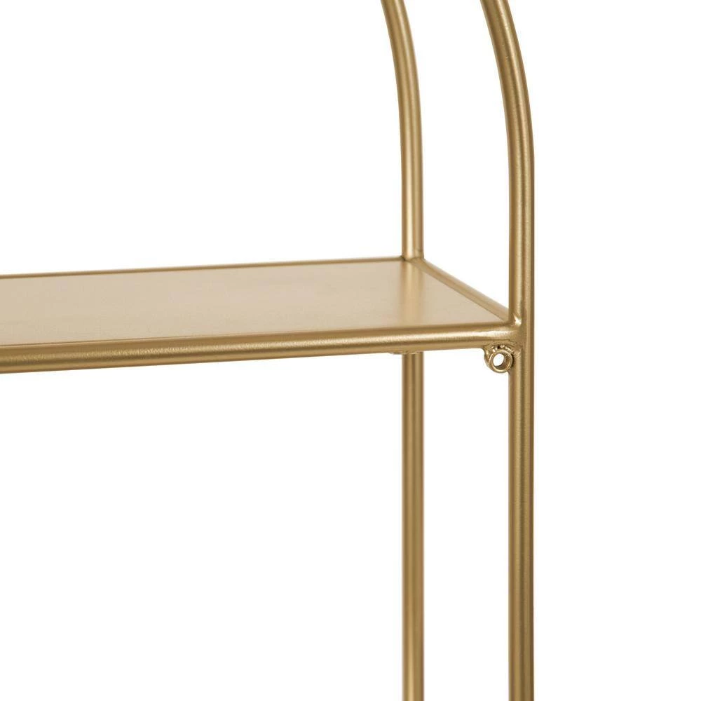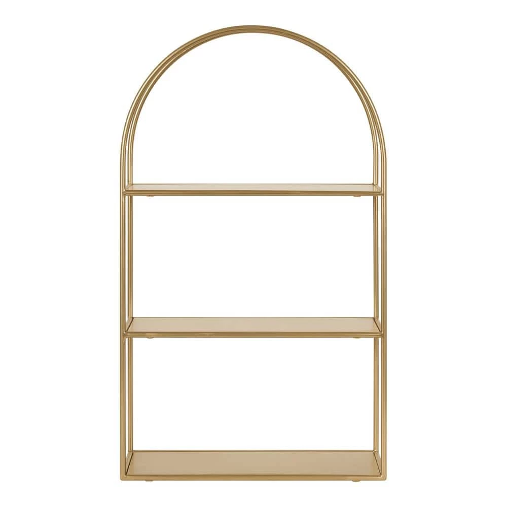 Invest in wall storage that matches your style with the glamorous Monroe wall shelf. Inspired by 21st-century design, this modern piece of wall decor features a sophisticated arched frame and three tiers of shelving. The Monroe shelf’s edge has a painted gold finish to create a glamorous and beautiful look, elevating its luxurious aesthetic across your home decor. The overall dimensions of the Monroe shelf are 18 inches wide by 6 inches deep by 30.75 inches tall, and each tier is 17.25 inches wide by 6 inches deep, creating ample storage for your favorite decor or household items. The shelf tiers are also separated by 6 to 9 inches of height to store taller items! Use this shelf as bedroom, entryway, or bathroom decor while providing a small space to store your favorite items. In addition, it’s great for toiletries, small books, house keys, nonperishable ingredients, and more! YOu can also use it as glamorous living room decor and store media next to the television, creating a theme that hearkens back to classic art deco. To mount this minimal yet charming shelf, use the metal eyelet hangers cleverly concealed within the frame.