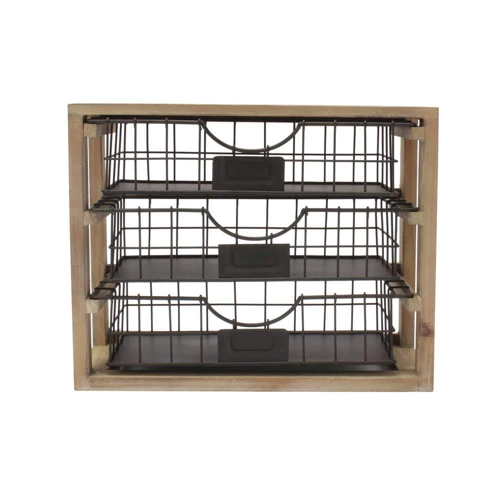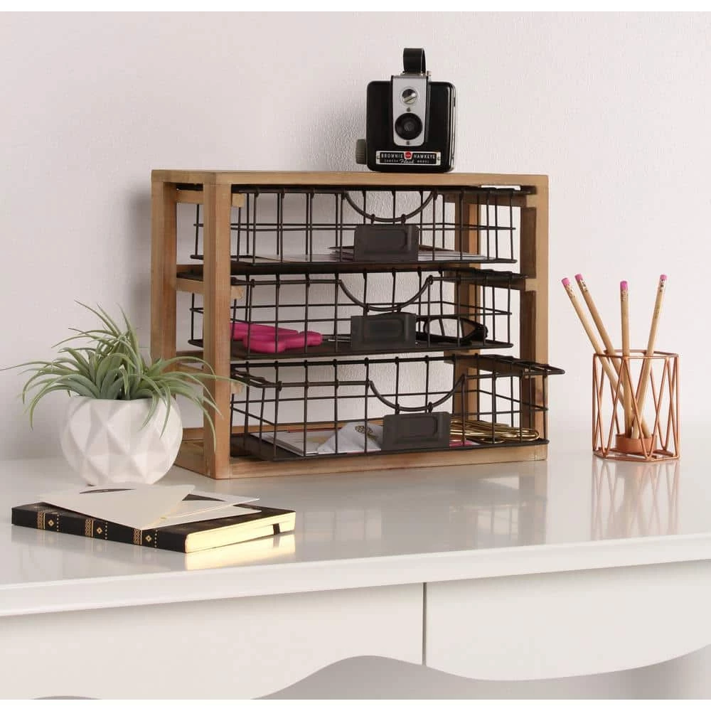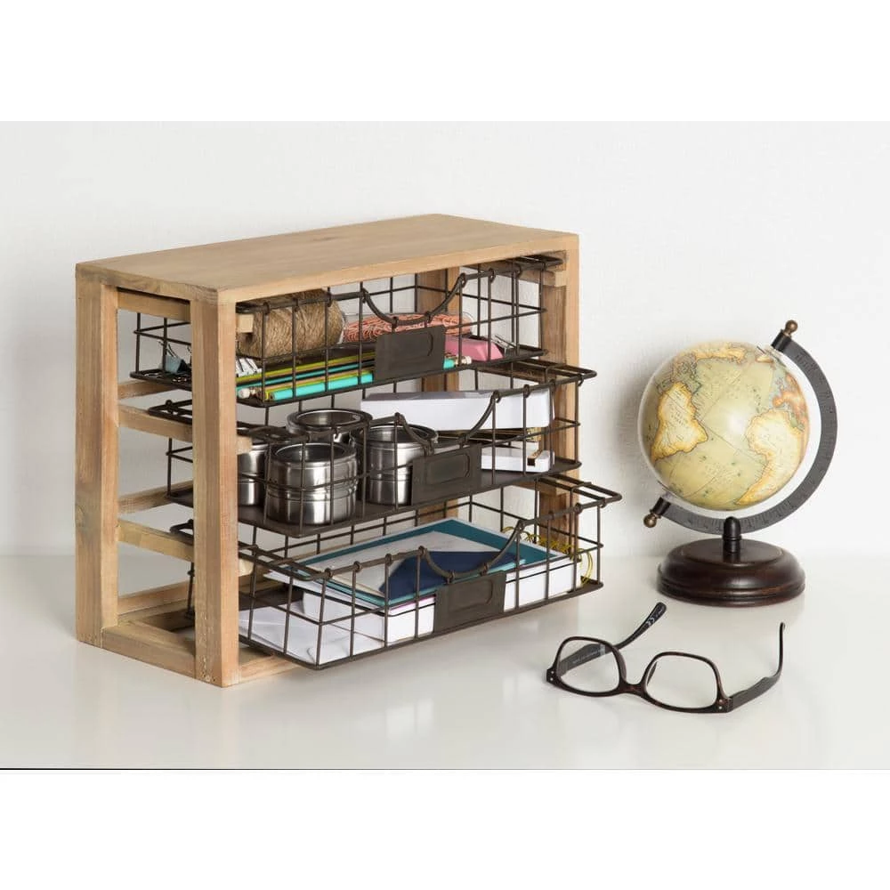 Store away your office supplies, make up, or other odds and ends in this charming small desktop wire metal drawers. These desktop drawers are constructed of rustic solid wood with 3 metal drawers each with a metal label holder. This rustic chic set of drawers is perfect to hold paper clips, pushpins, or other desk accessories in your home office. It can also be used in your bathroom or vanity to hold make up palletes and brushes. Each of the three drawers has an inner area of 10.75 in. x 5.5 in. x 2.5 in.. The overall size of the drawer set is 13.75 in. W x 10.875 in. H and 6.125 in. deep-perfect for your home office desktop.