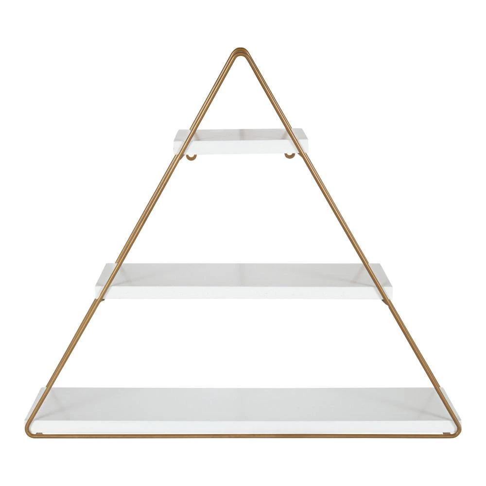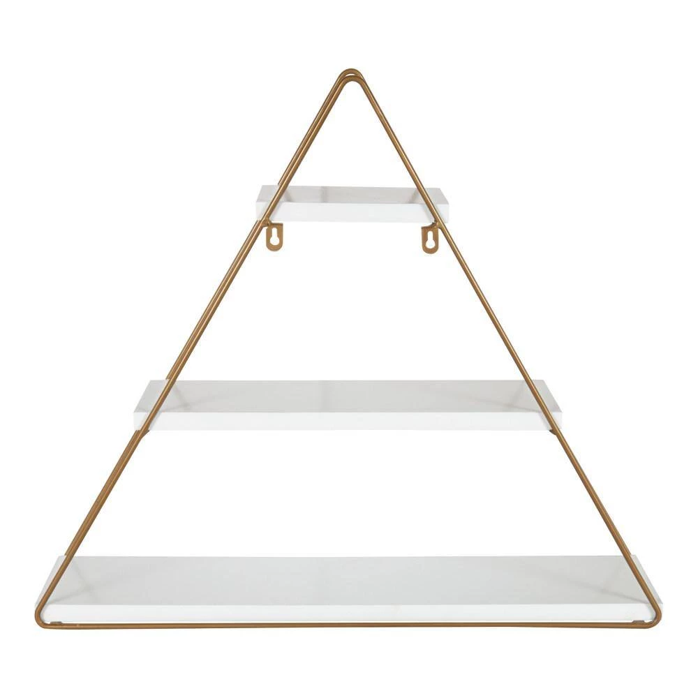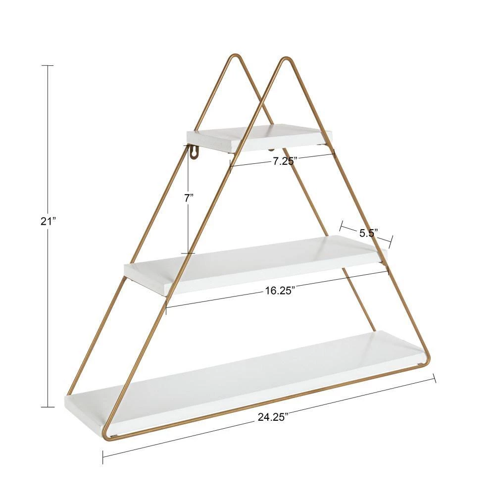 - Modern decorative, design, these decorative triangle floating wood wall shelves are secured with a gorgeous gold painted metal frame that holds 3-wood shelf boards finished with a white painted finish