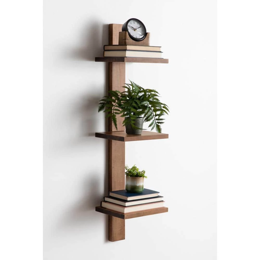 Add a contemporary piece of transitional wall decor with the Udell Three-Tiered Wall Shelf. Its trendy, floating design saves space in your home by adding a simple, wall-mounted display. There are 12 in. of space between each shelf for your favorite keepsakes and plants. The Udell Shelf pulls inspiration from mid-century spine book towers, with three graduated shelves to stack or showcase your vintage hardcovers and paperbacks. It’s not just for your prized first editions, however: use it to display your favorite small and mid-size plants, collectible keepsakes or photos of family and friends. Each of these shelves is ten in. Long by eight in. Wide, giving you ample room to store your items. They appear to float thanks to hidden screws securely attached to the back of the vertical base plank. Mount it in seconds with included hardware and minimal assembly. A 3-tiered shelf makes an excellent addition to your small spaces, providing an efficient, spacing-saving area for your keepsakes. Create a larger wall display by adding multiple Udell shelves for additional storage and unique symmetry.