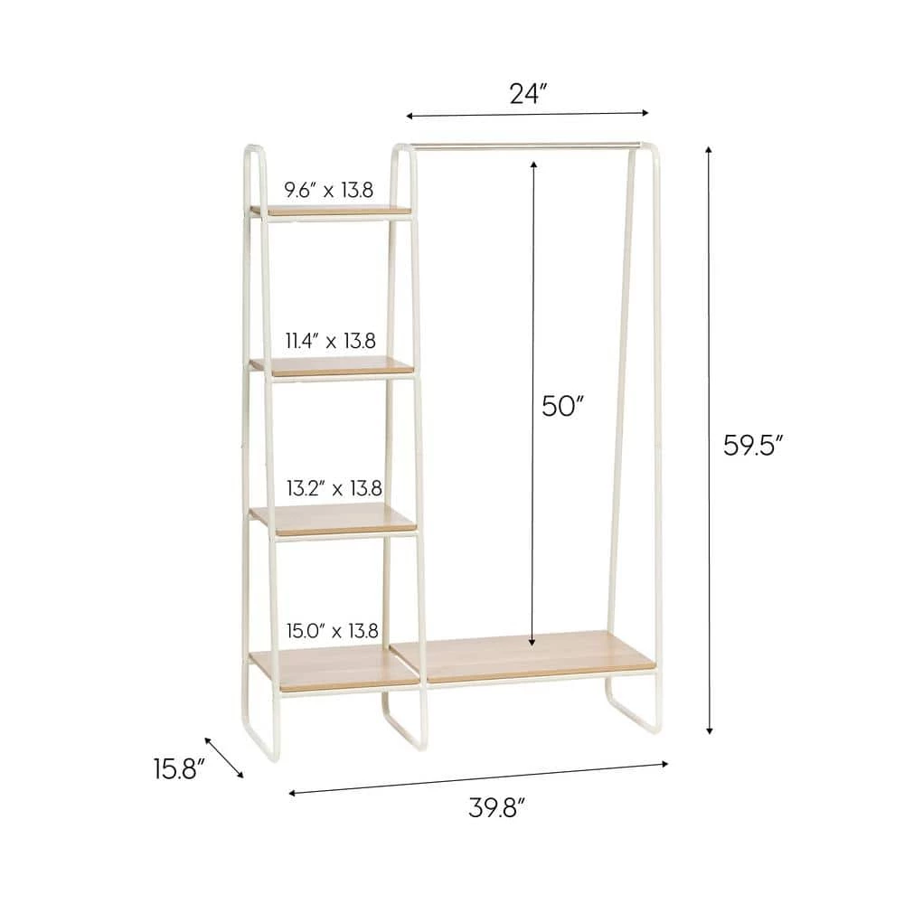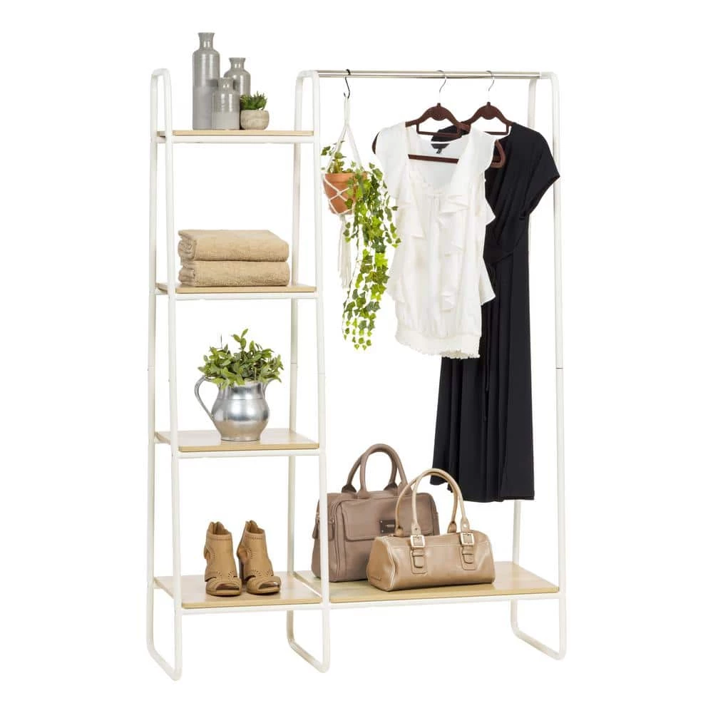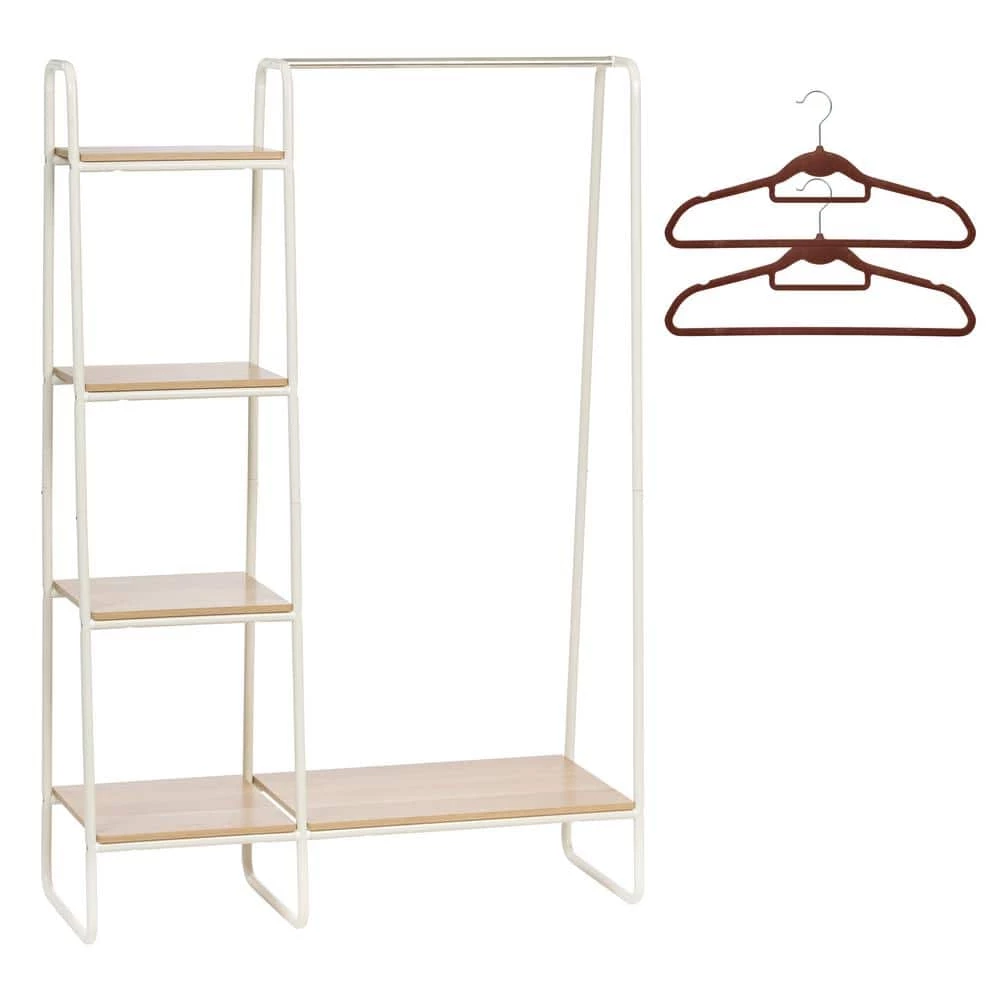 - Wooden shelves on bottom and side of the clothes rack for storing shoes, accessories, and more