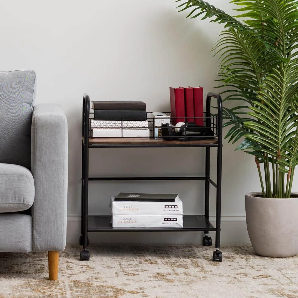 Wide wood and metal rolling cart is as versatile as it gets. All-round storage cart fits any decor around your home; use as a serving cart, a dry food pantry, clothes storage, or as an additional office storage under the desk, try out where this wide cart fits you the best. Features smooth gliding caster wheels for easy mobility and locking wheels keep the multi-functional cart in place. Keep books, magazines, remote control or small electronics within your reach in this multifunctional rolling cart. The cart holds up to 22 lbs. Indoor use only. For safety, do not allow children to climb on or play with the product.